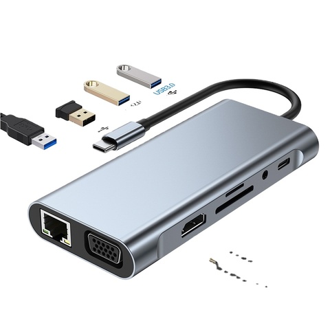 10 11 en 1 Type-c USB 3.0 Hub Multiport Station d'accueil pour ordinateur portable Type C à 4K HDMI VGA PD RJ45 100M Gigabit Adaptateur de carte réseau