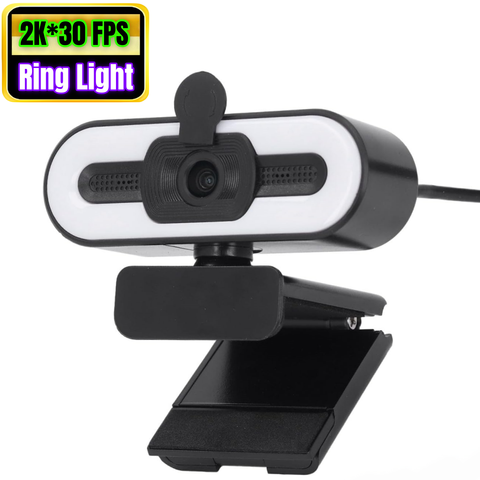 Webcam USB 2K 1080P para Desktop PC Laptop com Microfone Luz de Anel em 3 Cores Tampa de Privacidade Visão de Ângulos Largos
